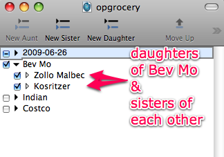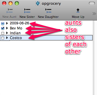 Very interestingly, it conceptualizes the levels of an outline as aunts, sisters and daughters. The hierarchy is Aunts>Daughters. Sisters are peer-level topics.