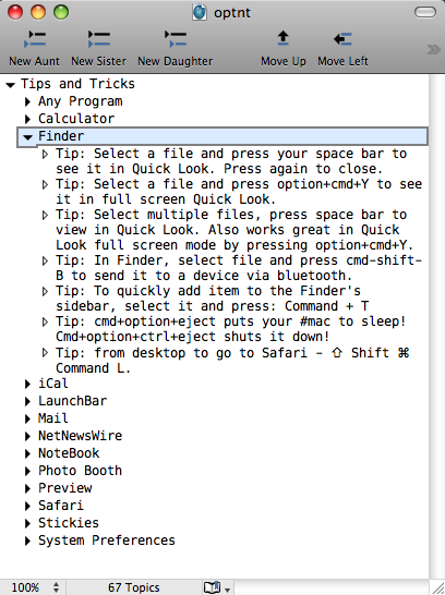 Usage Note: When you mount the disk image of Opal, you will find a PDF file on the image called All About Outliners. You should read this to get an excellent overview of what you can expect from an outlining program.