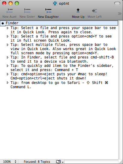 You hit enter to get a new topic, or you use the toolbar buttons. You click on the New Aunt button to get a topic at the level above where you are in the outline. Anytime you are working in the outline, you can click the New Sister button to get another topic at the same level of the outline that you have been working on. To get a topic at a level lower than the one you are working on, you can click on the New Daughter icon.