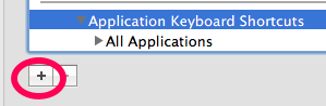 Scroll to the bottom of the list. Highlight Application Keyboard Shortcuts and click on the + button at the bottom of the dialog box.