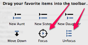 Work on your section and press the Unfocus icon to get the whole document to concentrate on again. Very useful, when you want to dig deep into parts of an outline.