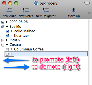 I must say that I much prefer keyboard commands to clicking on icons. Opal lets me do this easily. I hit return to get a new topic, then I can choose to keep it at the level it is or to promote it, I can press the keyboard command: Command +Shift+L (for left). To demote it, I can press the keyboard: Command +Shift+R (for right). I love this arrangement of the keyboard commands. Visually, taking a topic left, promotes it, while taking a topic right, demotes it. Very intuitive. If you don't like keyboard commands, and have to use the mouse, the icons on the toolbar perform the same functions.